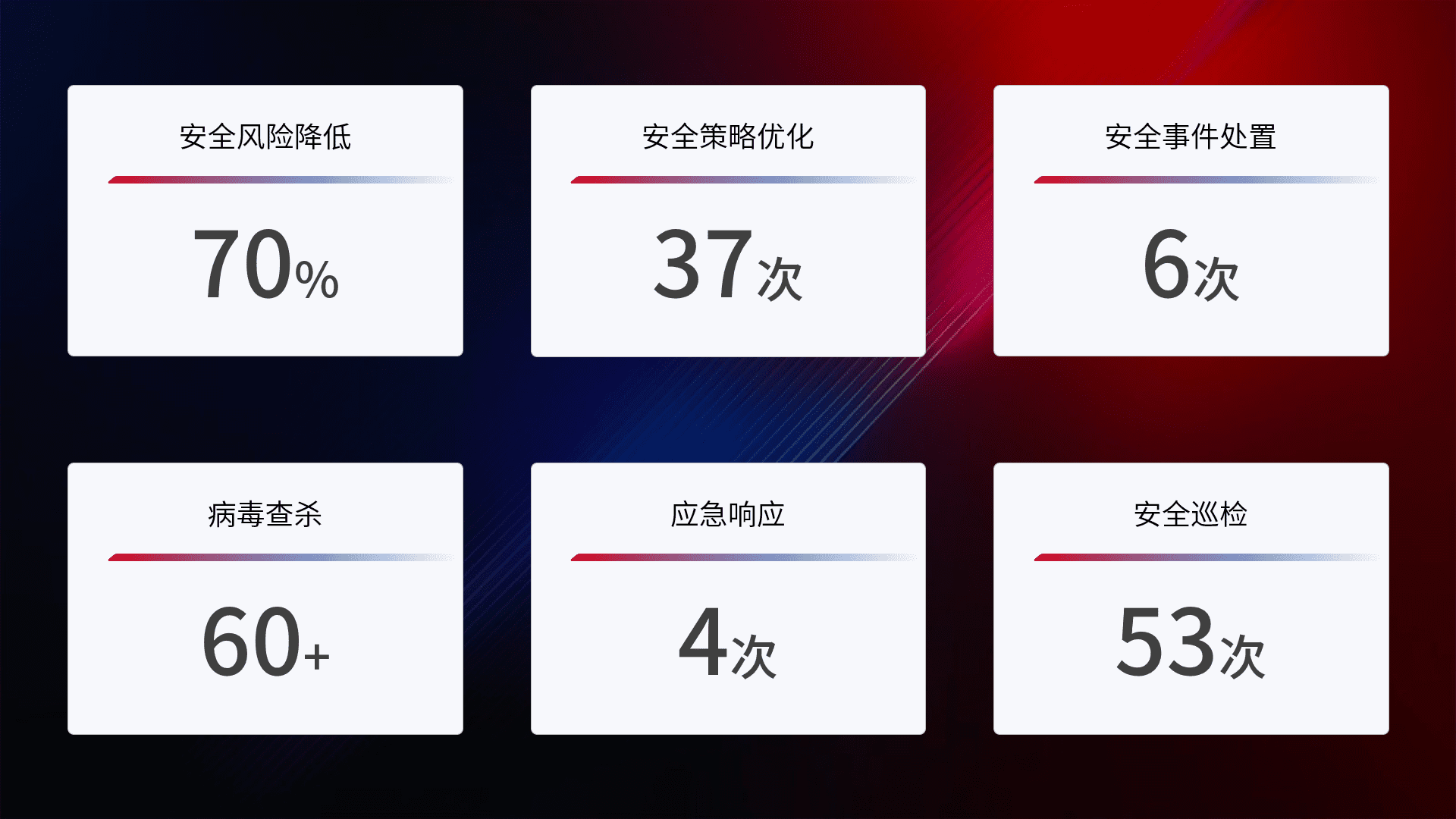 提供全面的安全事件报告体系,,,包括处置报告、、、周报、、、、季度和年度总结,,结合持续监控,,,,帮助客户深入了解网络安全状况。。